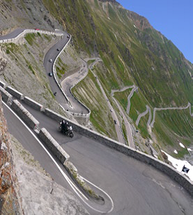 The spectacularly beautiful roads in the Alps make for a motorcyclists dream. It is truly a surreal experience riding along roads that are bordered with snow at the mountain peaks. One after another, the twists and turns, the hairpin bends, or switchbacks, as they are known in Europe, the long sweeping bends, the vistas and beautiful scenery that greet you at each lookout point, make for heaven on earth if you are lucky enough to travel these roads, and traverse the mountains and villages by motorcycle.